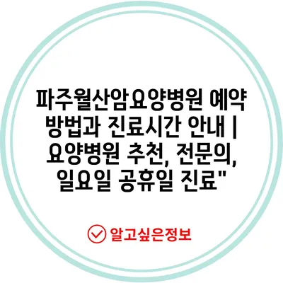 ✅ 파주월산암요양병원의 예약 방법과 진료시간을 지금 바로 알아보세요.